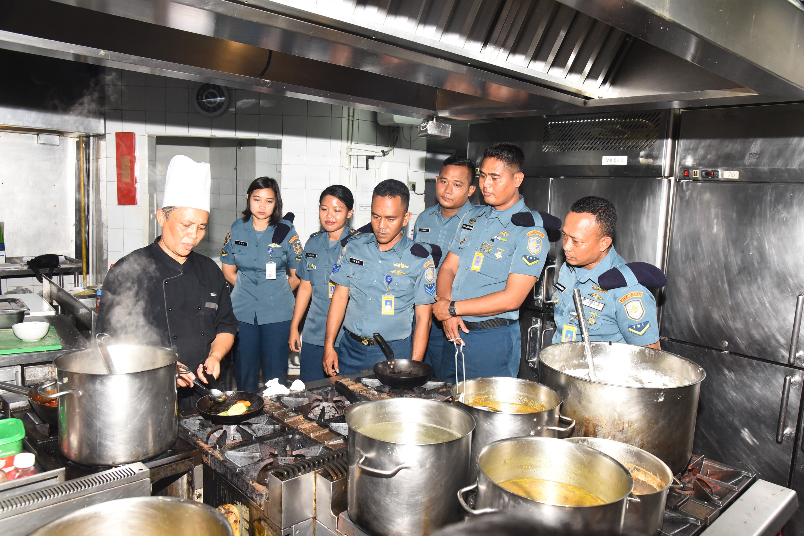 Kolinlamil TNI AL, 14 Januari 2025 ——- Sekitar 15 juru masak yang bertugas di Kapal Perang TNI Angkatan Laut yang berada dibawah jajaran Kolinlamil, mendapatkan pelatihan dari chef handal yang dimiliki Hotel Mercure Convention Centre, Ancol Jakarta Utara pada hari Selasa (14/1). Pelatihan ini digelar guna meningkatkan kemampuan mereka dalam meracik menu makanan Indonesia sekaligus dalam rangka mendukung program makan bergizi yang akan digelar dalam waktu dekat di KRI jajaran Kolinlamil. Adapun juru masak tersebut berasal dari KRI Banda Aceh 593, KRI Tanjung Kambani 971 dan KRI Mentawai 959.