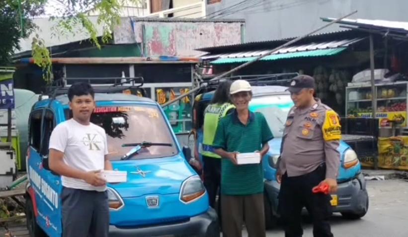 Pembagian nasi sebagai bentuk kepedulian Polri dan rasa empati kepada mereka pejuang nafkah sopir Kancil yang sedang mangkal menunggu penumpang yang setiap hari bekerja dijalanan.