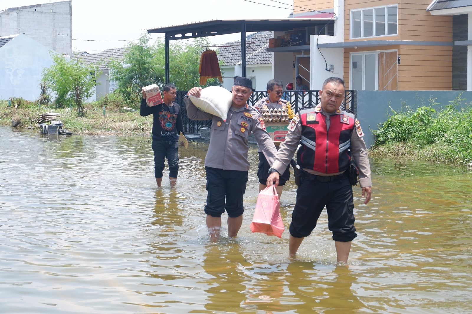 Tak berhenti di situ, rombongan melanjutkan perjalanan ke rumah Aipda Boyke Simarmata di Perumahan Pondok Permata, Babelan, Bekasi. Meski ketinggian air di rumah Bhabinkamtibmas Kelurahan Ancol ini lebih rendah, sekitar 30 cm, dampaknya tetap dirasakan oleh keluarga.