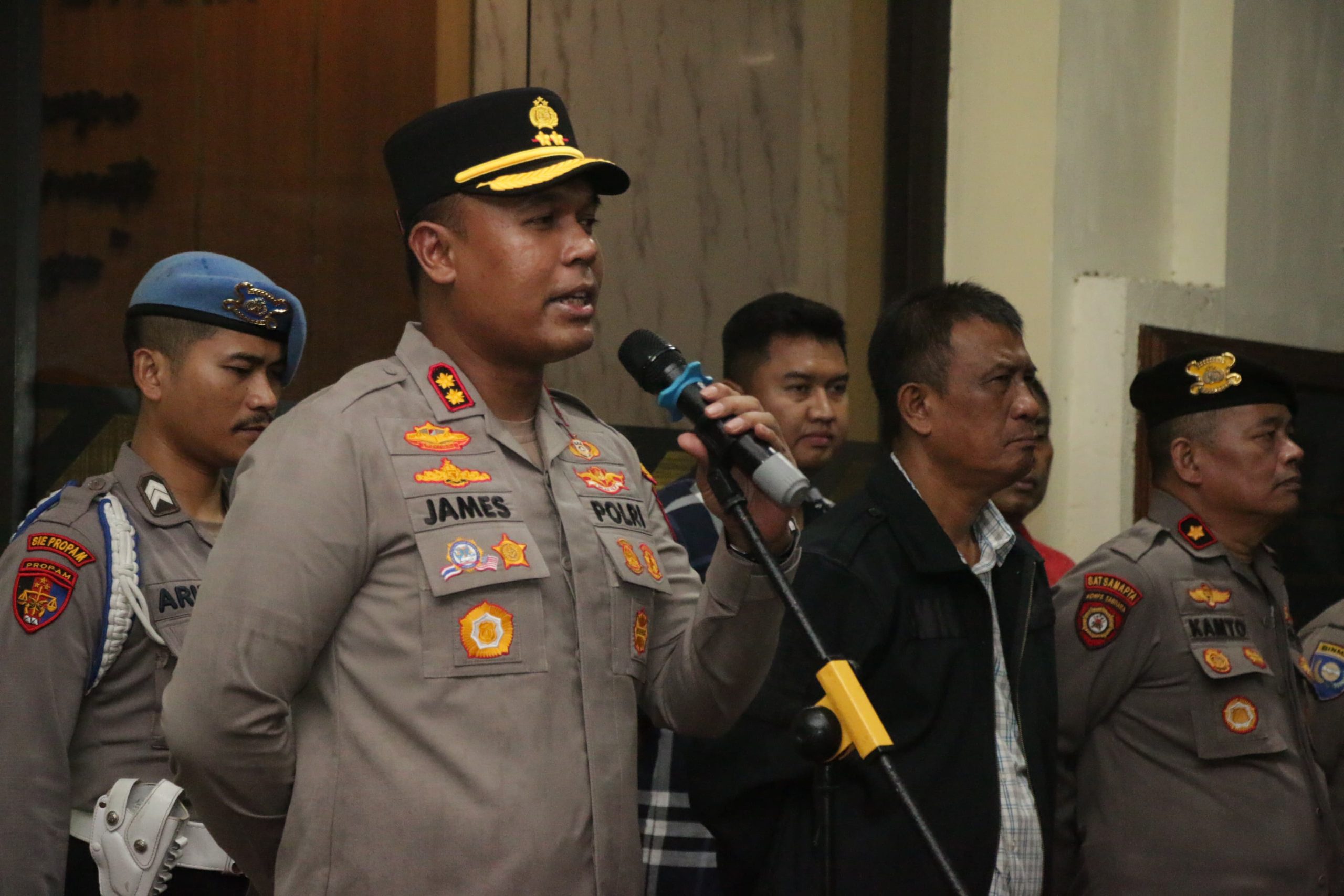 Dalam arahannya, AKBP James menyampaikan apresiasi atas semangat dan dedikasi para anggota yang tetap hadir melaksanakan tugas meskipun di tengah cuaca hujan dan berangin.