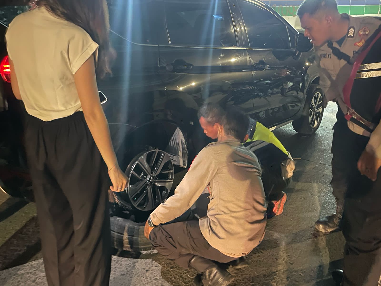 Dipimpin oleh Kapolsubsektor Lodan, Aiptu AP Gultom, bersama Aipda Boyke Simarmata selaku Bhabinkamtibmas Ancol dan anggota lainnya, Brigadir Triyadi, Brigadir Adriyono, serta Bripda Saiful Bahar, mereka tak sekadar menanyakan kondisi, tetapi langsung turun tangan membantu mengganti ban mobil yang rusak.