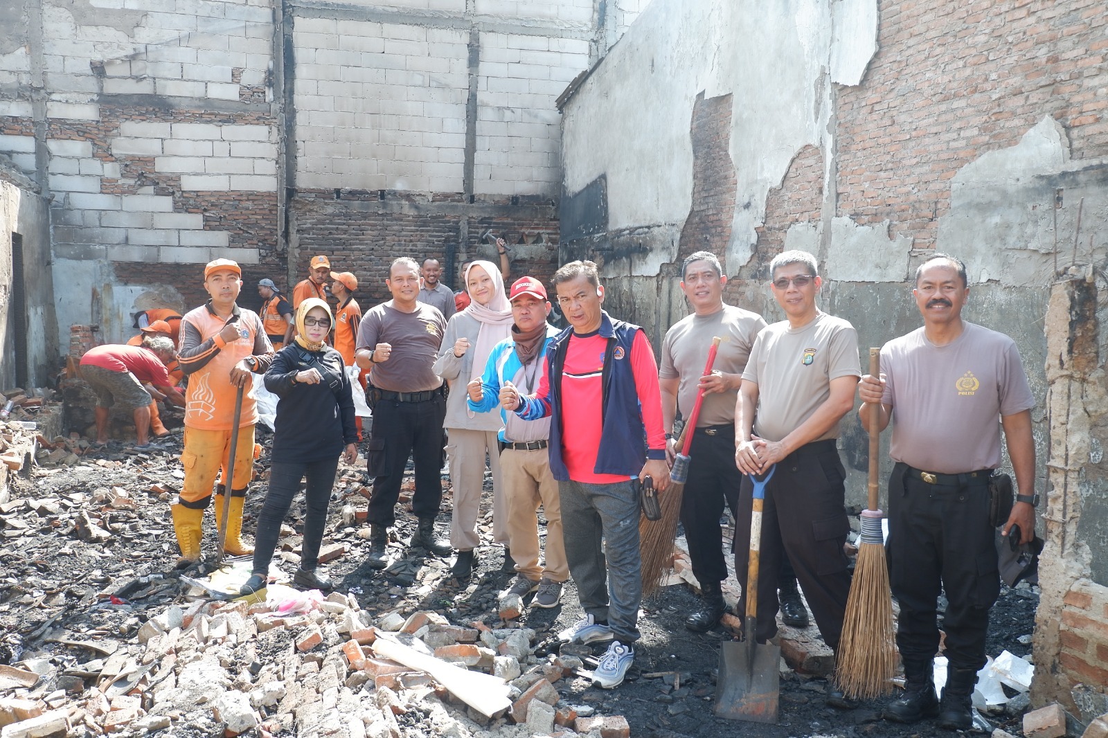 Jakarta – Polsek Pademangan bersama unsur kelurahan dan masyarakat menggelar kegiatan kerja bakti di lokasi bekas kebakaran yang terjadi di Jl. Budi Mulia Gang E RT 05/06 Kelurahan Pademangan Barat Kecamatan Pademangan Jakarta Utara, Minggu pagi (11/5/2025).