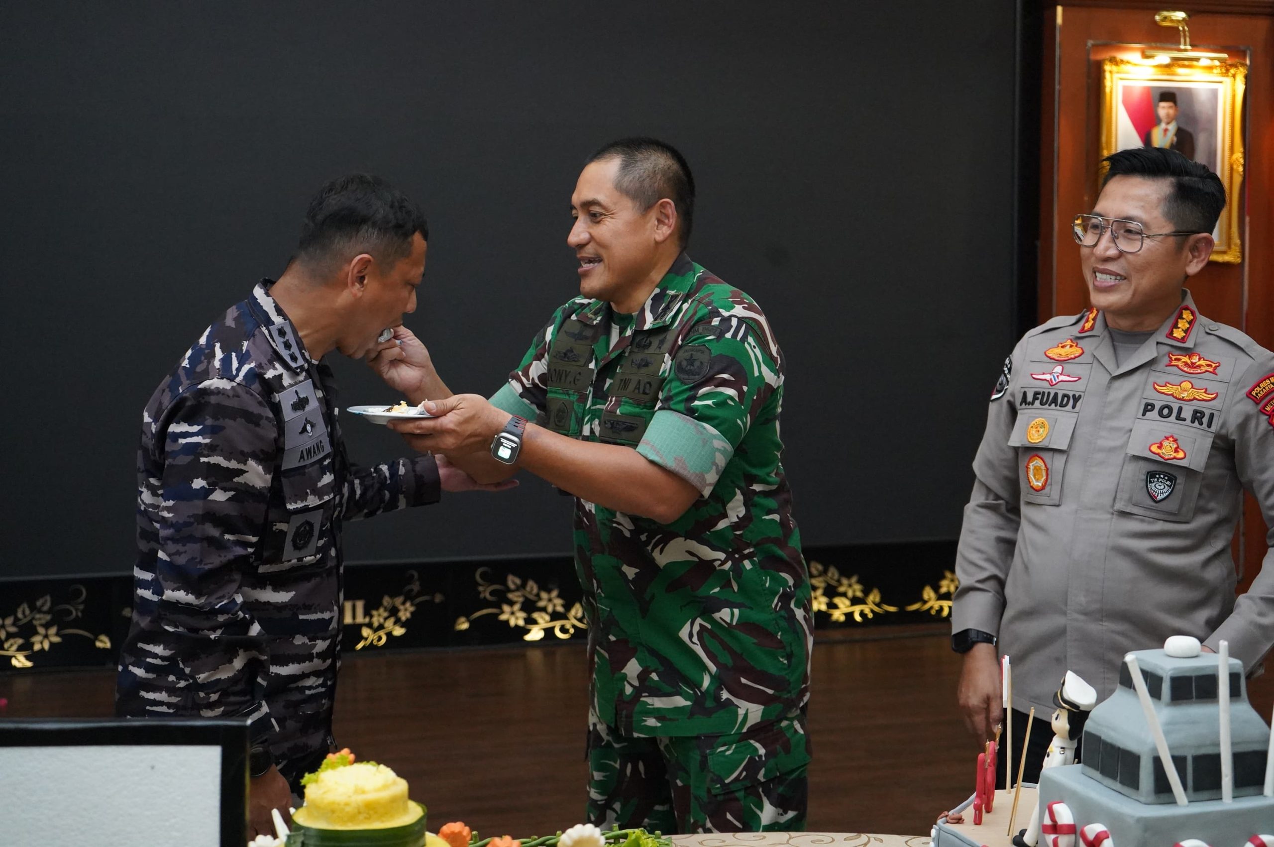 Jakarta Utara – Kejutan hangat datang dari Polres Metro Jakarta Utara untuk jajaran Komando Lintas Laut Militer (Kolinlamil) dalam rangka peringatan Hari Ulang Tahun ke-64 lembaga tersebut. Pada Selasa (1/7/2025) siang, Kapolres Metro Jakarta Utara, Kombes Pol. H. Ahmad Fuady, S.H., S.I.K., M.H., beserta seluruh pejabat utama (PJU) Polres mendatangi Markas Komando (Mako) Kolinlamil dengan membawa tumpeng dan kue ulang tahun sebagai bentuk apresiasi dan kekeluargaan antara Polri dan TNI AL.