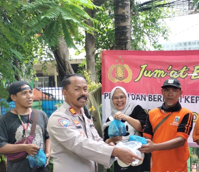 Dalam kegiatan tersebut, Wakapolsek Pademangan, AKP Damun, S.H., bersama Bhabinkamtibmas Kelurahan Pademangan Barat, Bripka Iwan Wahyudi, turun langsung ke lapangan untuk membagikan 20 nasi kotak kepada masyarakat yang melintas di sekitar lokasi.