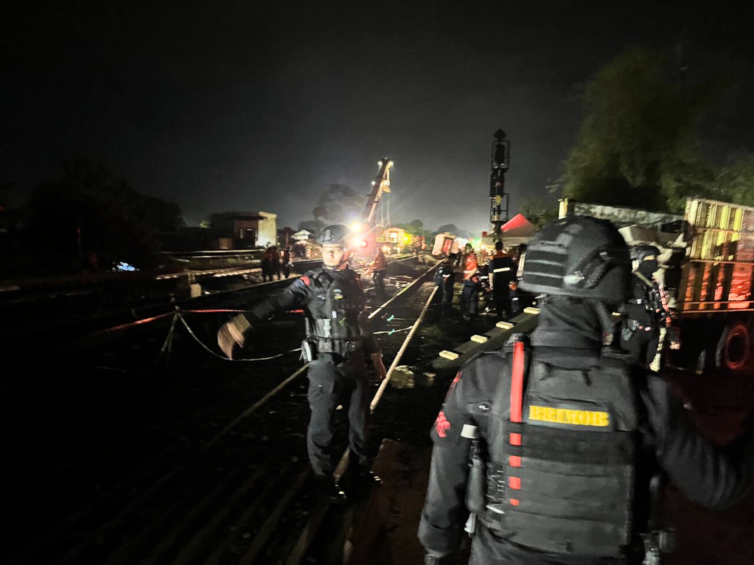 Setibanya di lokasi sekitar pukul 20.15 WIB, personel Brimob segera berkoordinasi dengan pihak PT Kereta Api Indonesia (KAI), kepolisian setempat, dan instansi terkait lainnya. Mereka mengatur arus lalu lintas di sekitar lintasan yang terdampak akibat dua gerbong bagian belakang kereta anjlok. Jalur kereta sementara hanya dapat digunakan satu arah selama proses perbaikan berlangsung.