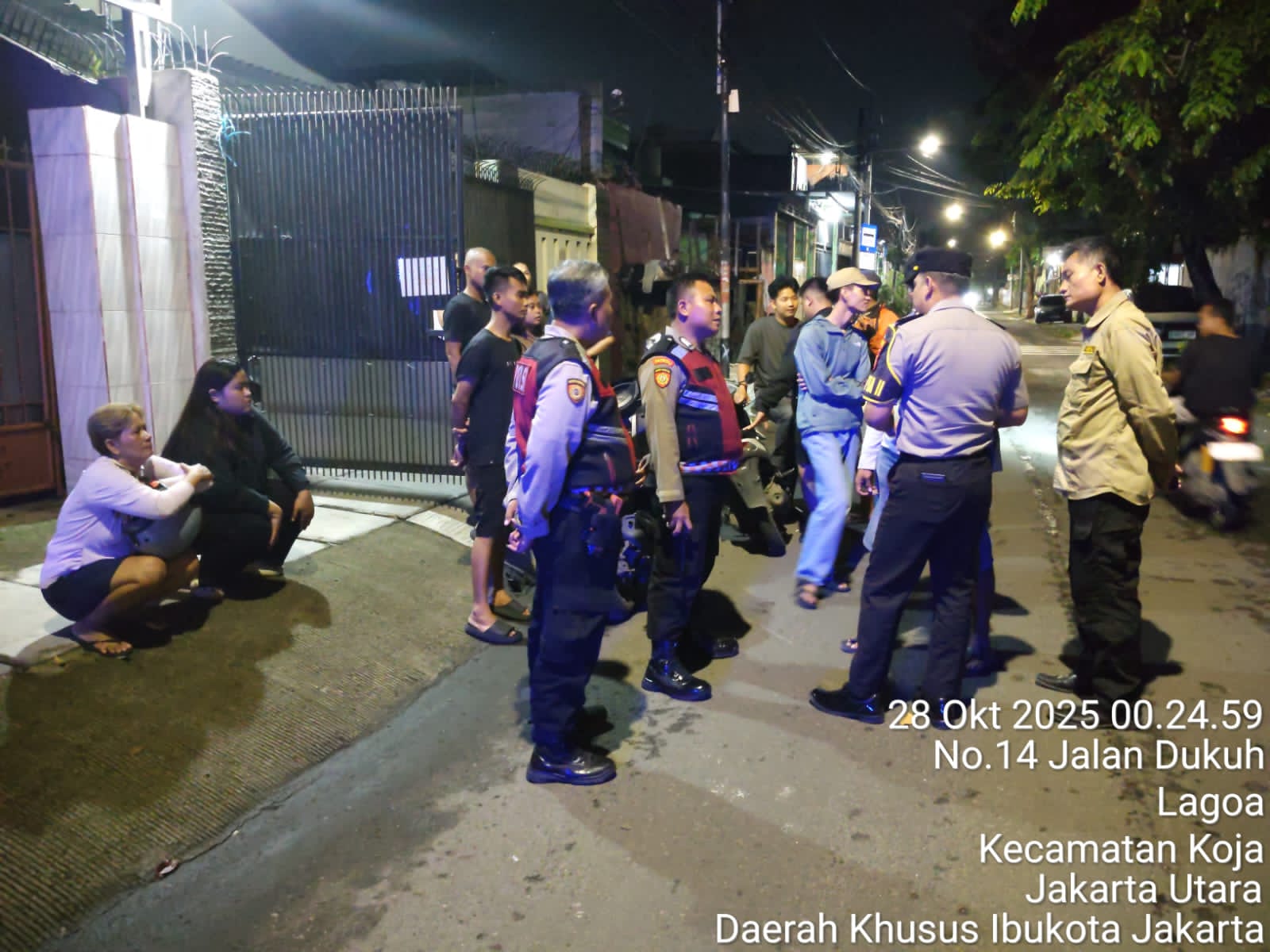 Jakarta Utara — Personel Polsek Koja Polres Metro Jakarta Utara melakukan patroli tertutup sekaligus menindaklanjuti laporan layanan darurat 110 terkait adanya keributan di wilayah Kelurahan Lagoa, Jakarta Utara, Selasa dini hari (28/10/2025).