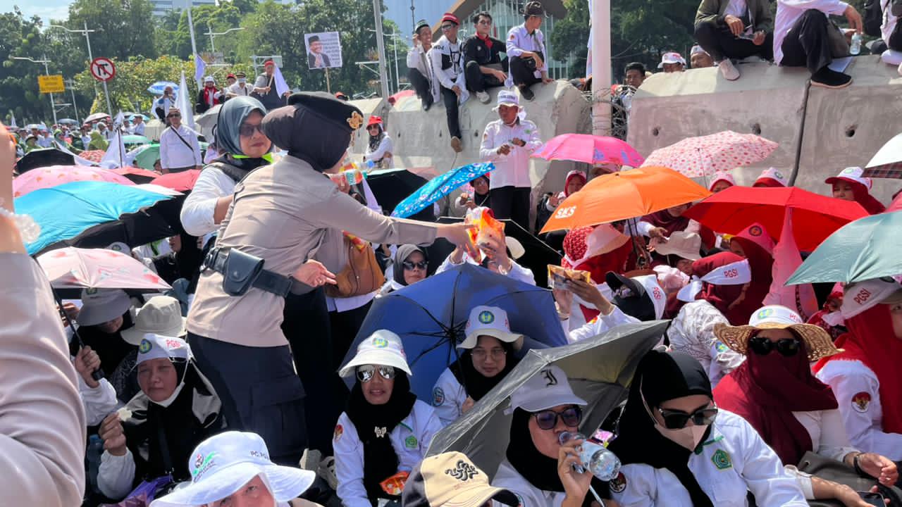 “Kami ingin menciptakan suasana sejuk dan bersaudara. Pembagian air mineral dan roti ini adalah bentuk empati dan kepedulian kami kepada para guru yang datang dari berbagai daerah. Mereka menyampaikan aspirasi dengan tertib, dan kami layani dengan sepenuh hati,” tuturnya.