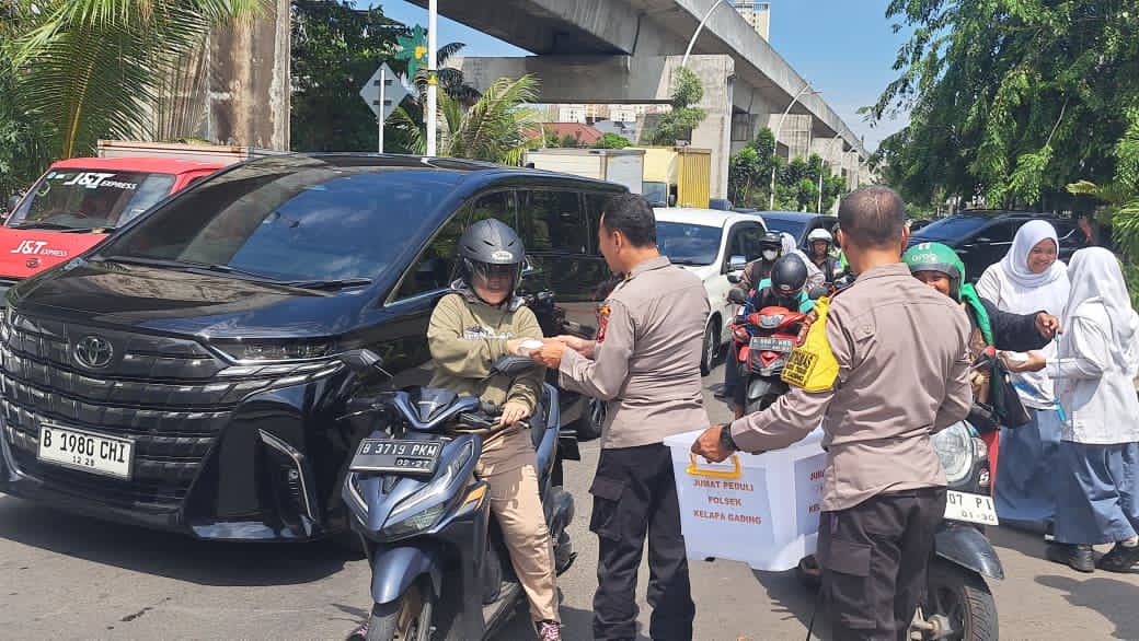 Jakarta Utara, — Polsek Kelapa Gading, Polres Metro Jakarta Utara, menggelar kegiatan sosial bertajuk Jumat Berkah melalui pembagian nasi kotak kepada pengemudi ojek online (ojol) dan warga sekitar, Jumat (7/11/2025). Kegiatan ini merupakan bagian dari program Jaga Lingkungan yang diinisiasi untuk mempererat hubungan antara kepolisian dan masyarakat.