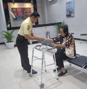 Dalam suasana layanan yang nyaman dan tertib, petugas tersebut terlihat mendampingi nasabah lansia yang menggunakan alat bantu jalan. Ia memberikan penjelasan secara perlahan dan jelas terkait proses transaksi melalui perangkat digital. Pendampingan dilakukan dengan penuh kesabaran guna memastikan setiap tahapan transaksi dapat dipahami dengan baik oleh nasabah.