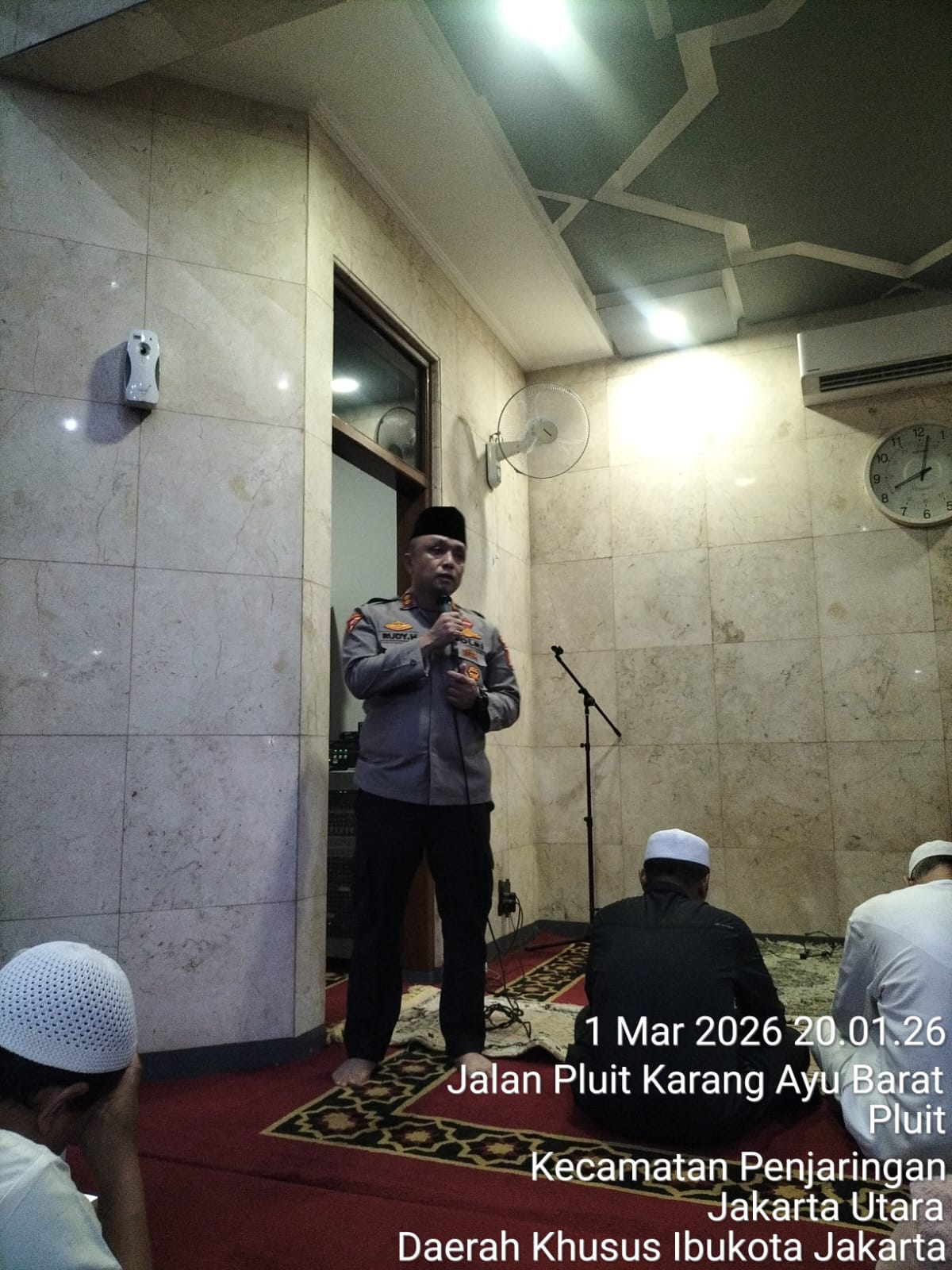 Suasana khusyuk menyelimuti Masjid Jami Raudhatul Jannah, Jalan Pluit Karang Ayu Utara, RW 02 Kelurahan Pluit, Kecamatan Penjaringan, Jakarta Utara, Minggu (1/3/2026) malam. Dalam rangka program Jaga Jakarta — Jaga Warga, jajaran Polres Metro Jakarta Utara menggelar kegiatan Tarawih Keliling (Tarling) sebagai bentuk silaturahmi sekaligus penyampaian pesan kamtibmas kepada masyarakat.
